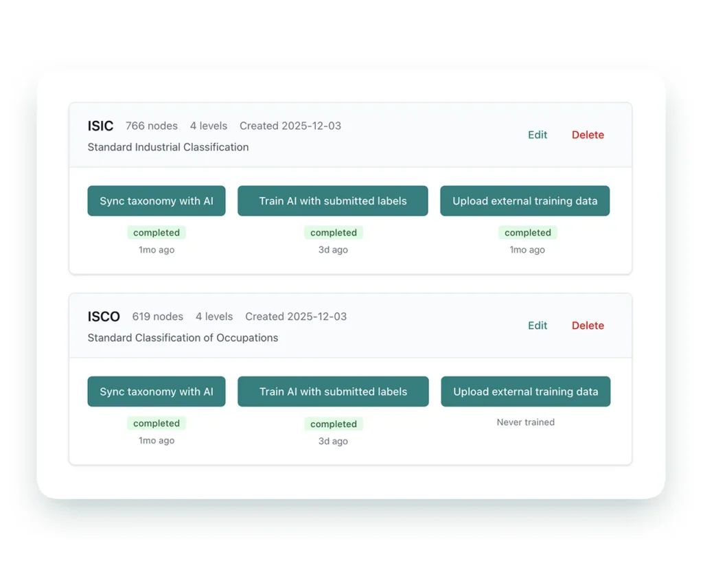 You can upload any multi-level hierarchical taxonomy up to 5 levels deep. This includes standard classification systems like ISCO (occupations), ISIC (industries), and COICOP (consumption), as well as your own custom taxonomies tailored to your specific needs.