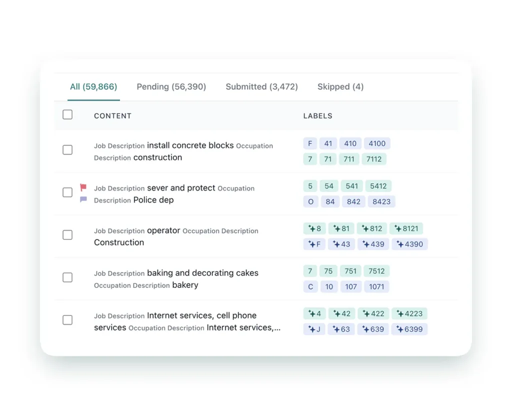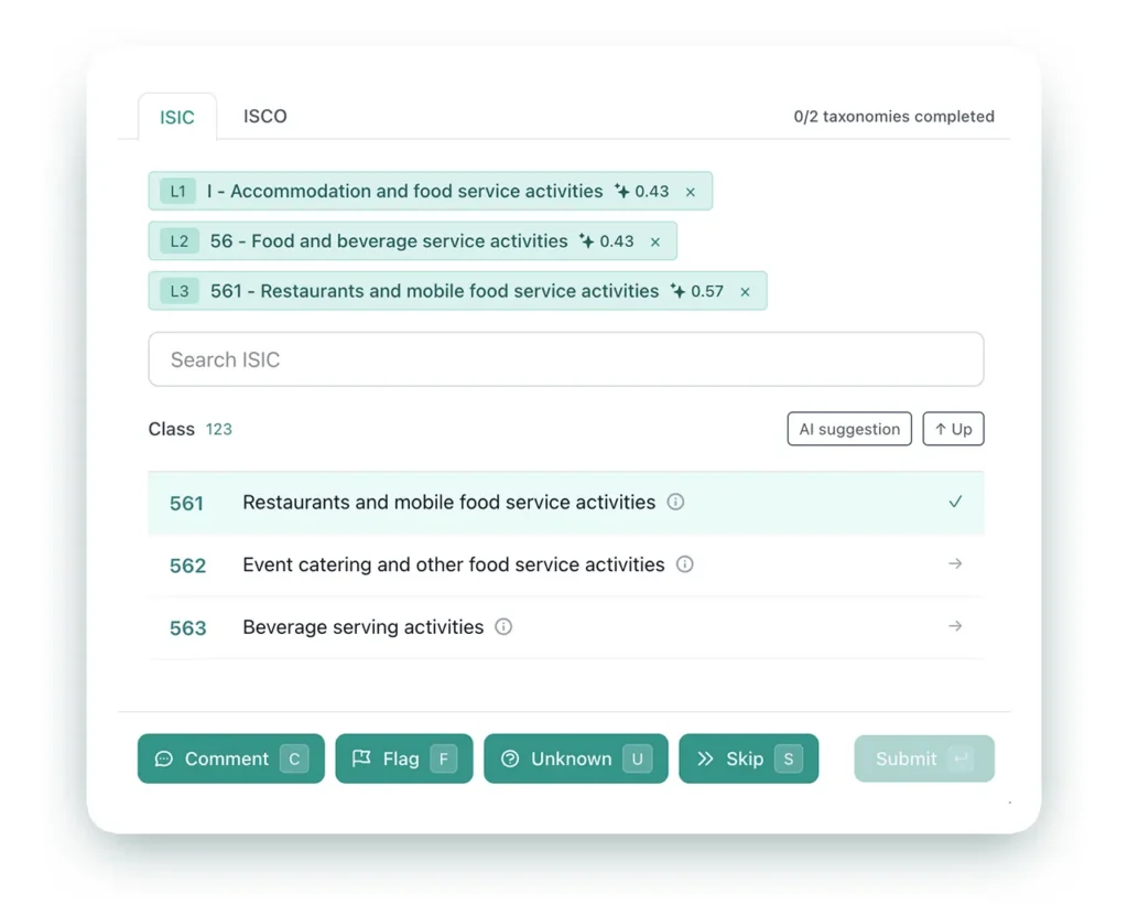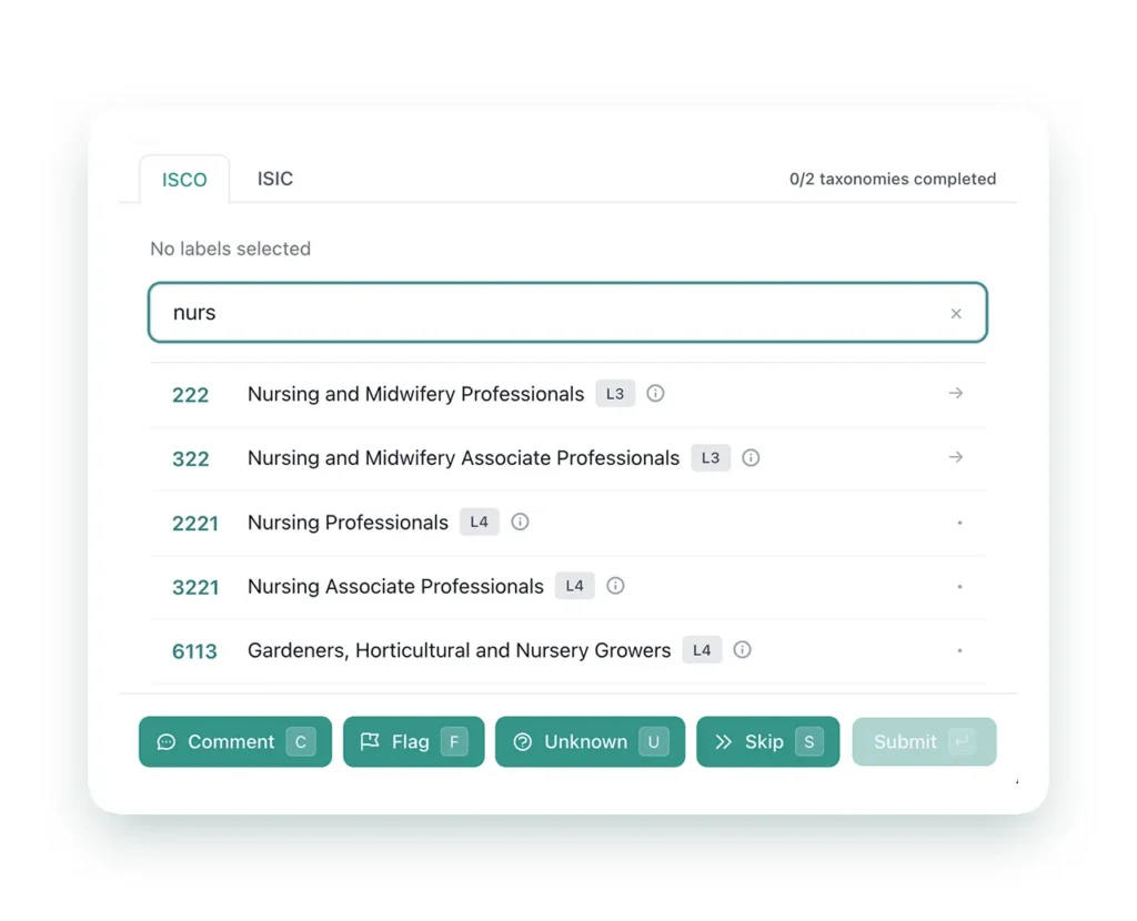 With 15+ years experience working alongside national statistics offices, we have set-up numerous classification exercises and labelled countless sentences. We know what works. Features like searchable taxonomy browsers or bulk actions make the tool intuitive and efficient for coordinators and annotators alike.