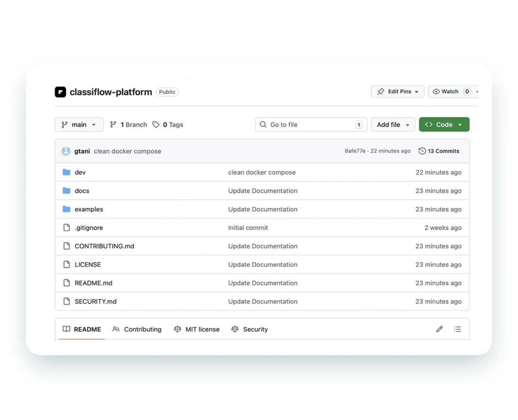 classiflow is open-source and free to use. Gain complete privacy, independence, and control over your data and software. Self-host on your own infrastructure or let us host it for you. Customize the tool however you like. Need help? We’ll set it up, integrate it into your data systems, or develop custom features.